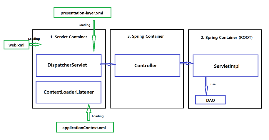 1. ContextLoaderListener 를 통해서=> applicationContext.xml 먼저 로딩되야함. (비지니스 컴포넌트 및 AOP 설정)